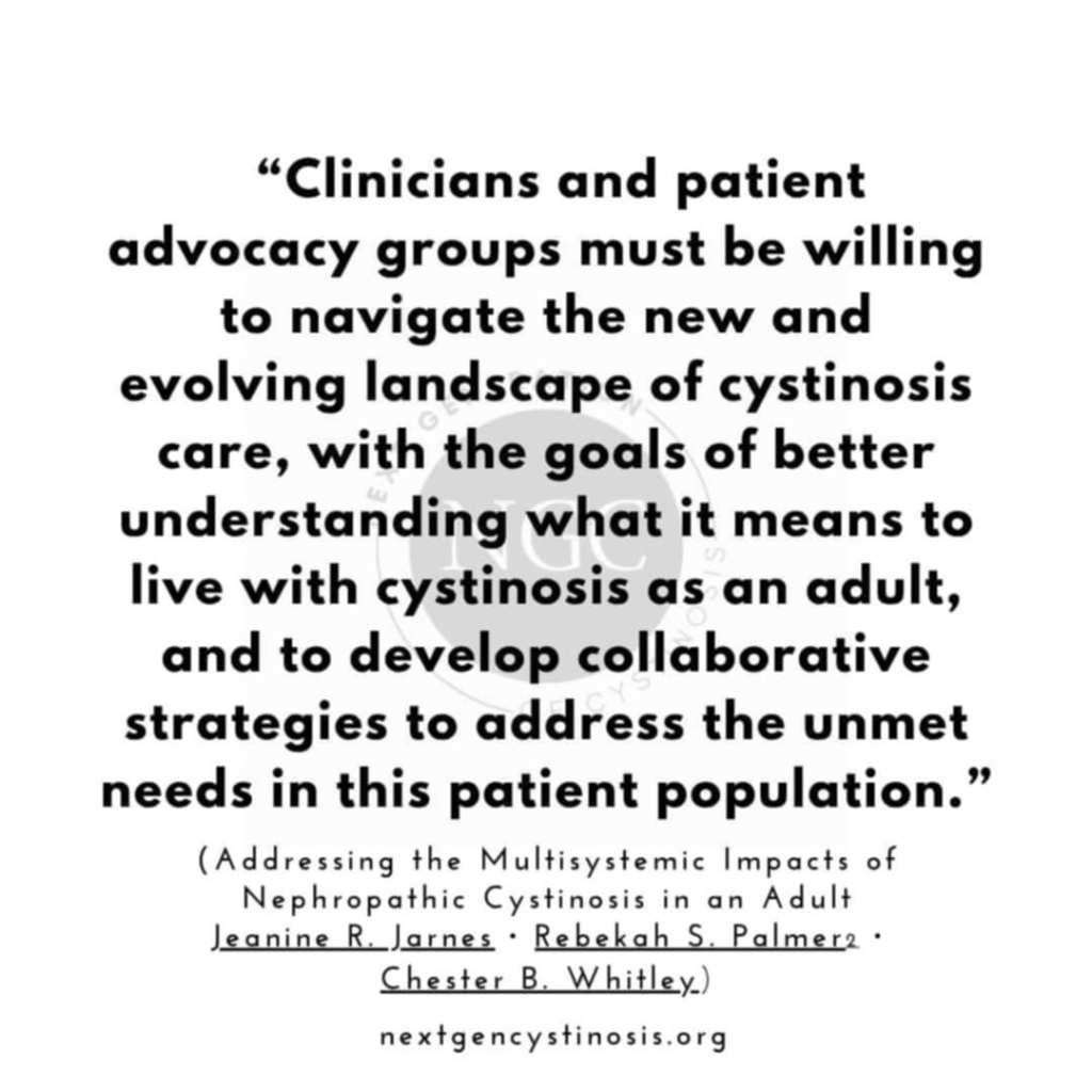 “Clinicians and patient advocacy groups must be willing to navigate the new and evolving landscape of cystinosis care, with the goals of better understanding what it means to live with cystinosis as an adult, and to develop collaborative strategies to address the unmet needs in this patient population.”